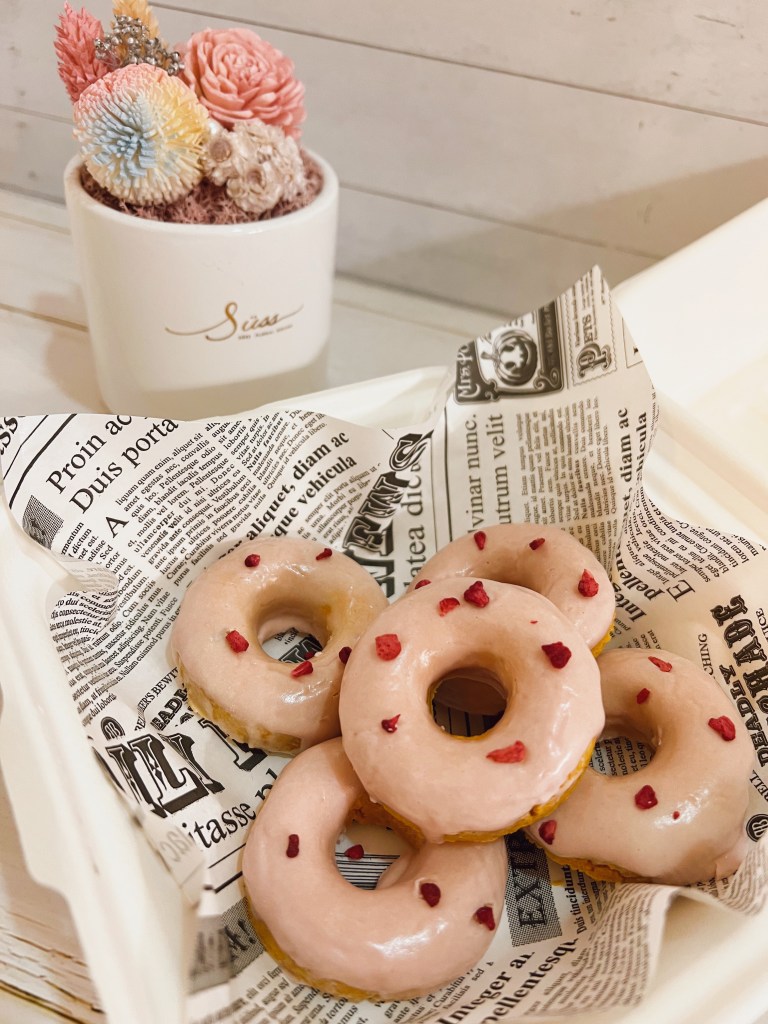 7️⃣ 將放涼的甜甜圈沾上奶霜淋面、裝飾喜歡的造型(可加天然蔬果粉調色)